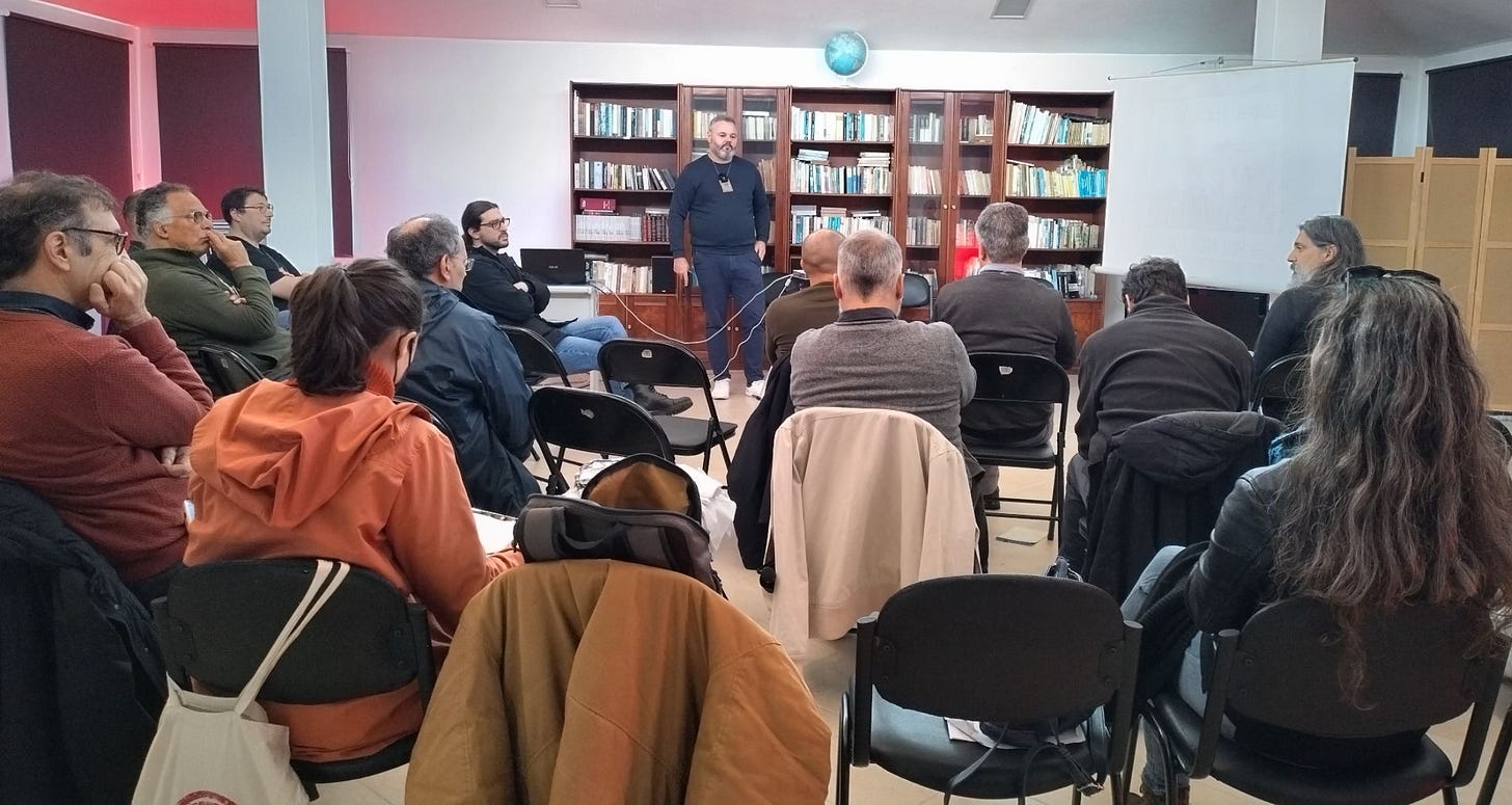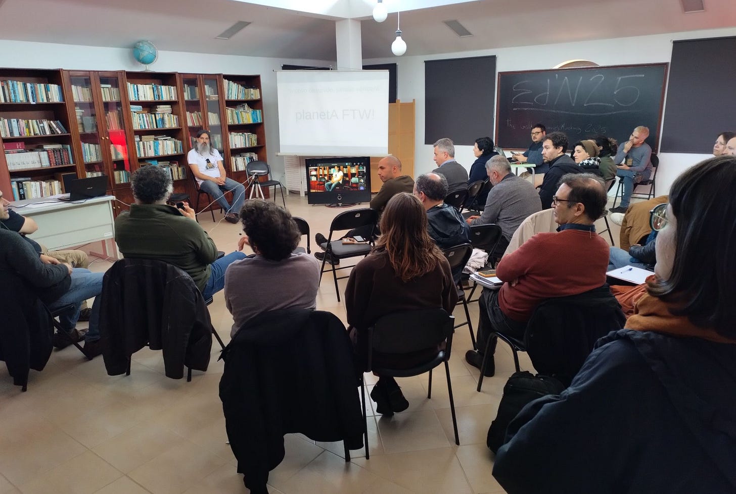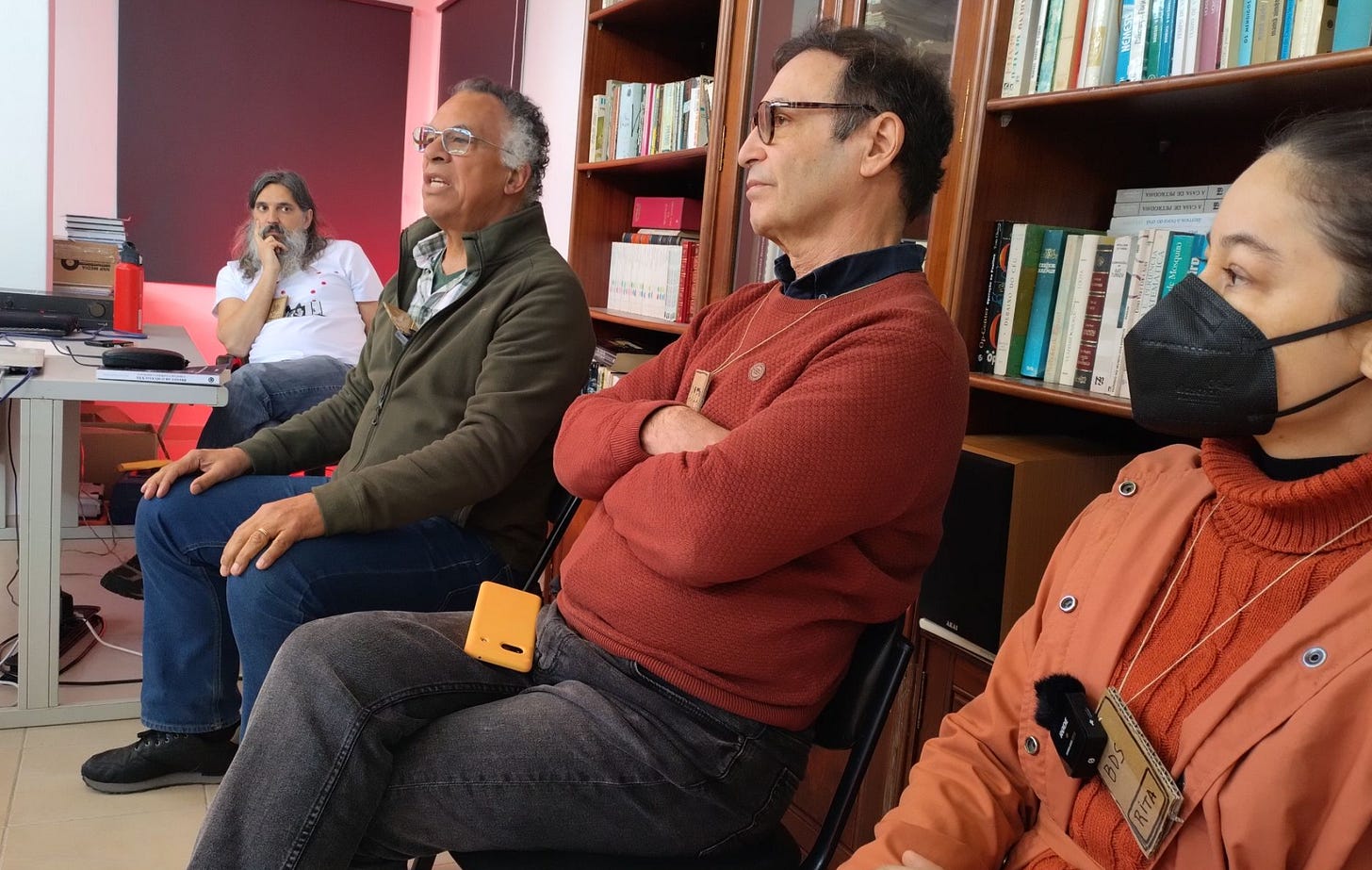 Na sua intervenção António Pedro Dores, professor aposentado do ISCTE, começou por abordar a actual crise civilizacional marcada pela escalada belicista de índole imperial. Apontou o dedo às elites ocidentais que nos colocaram numa trajetória rumo a uma possível III Grande Guerra, isto é, a aliança entre política, capital e guerra como forma organizadas de poder. Segundo António Pedro Dores isto é possível porque no quadro do Estado-Nação é fácil para as elites mobilizarem a colaboração dos povos contra os seus próprios interesses. Isso ocorre porque as gentes foram educadas para obedecer, vivem endividadas e são mantidas constantemente sob medo e repressão, como se viu na gestão autoritária da pandemia da COVID-19 e na cada vez mais frequente criminalização de grupos estigmatizados e opositores políticos. Foi esse contexto que facilitou a recente ascensão de discursos de ódio e práticas neonazi-fascistas no espaço público, traçando um paralelo histórico com outras épocas de opressão e desorientação. Salientou ainda que a solução passa por mudar a forma de pensar. Não de fuga para o irracional, mas de repensar criticamente os modos de análise e entendimento do mundo. Para florescer, é preciso reconhecer os erros do pensamento atual e aprender a pensar de forma radicalmente diferente.